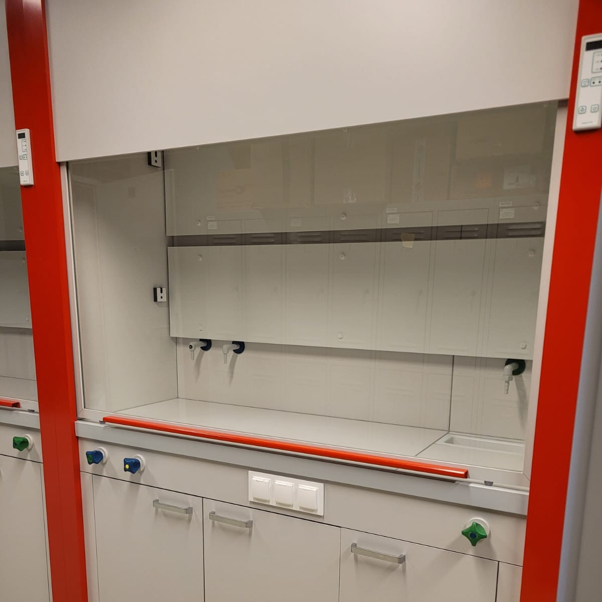 Dwa gniazda sieciowe 230V/16A w obudowie IP 44, wentylowane szafki podblatowe z kuwetami polipropylenowymi, oświetlenie LED komory dygestorium oraz czujnik przepływu powietrza, spełniający normę bezpieczeństwa PN-EN 14175:2006.