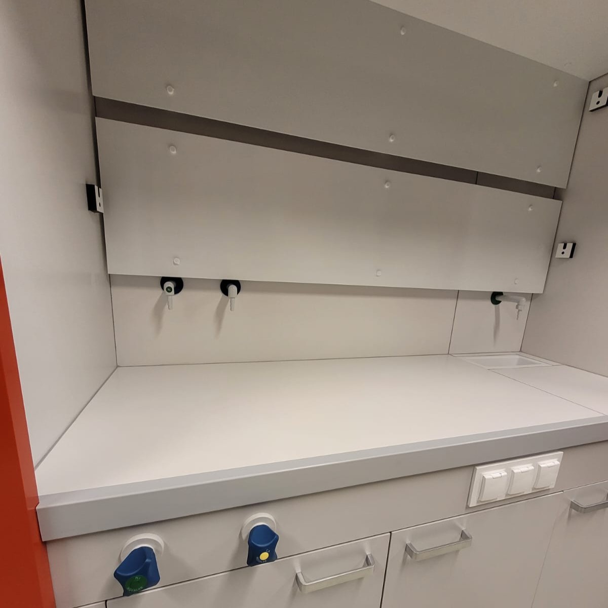 5. Media. Wewnątrz zabudowanej przestrzeni znajdują się wylewki wody, zawory gazów technicznych oraz gniazda elektryczne, co pozwala na przeprowadzanie kompletnych procedur badawczych bez konieczności wynoszenia aparatury na zewnątrz.